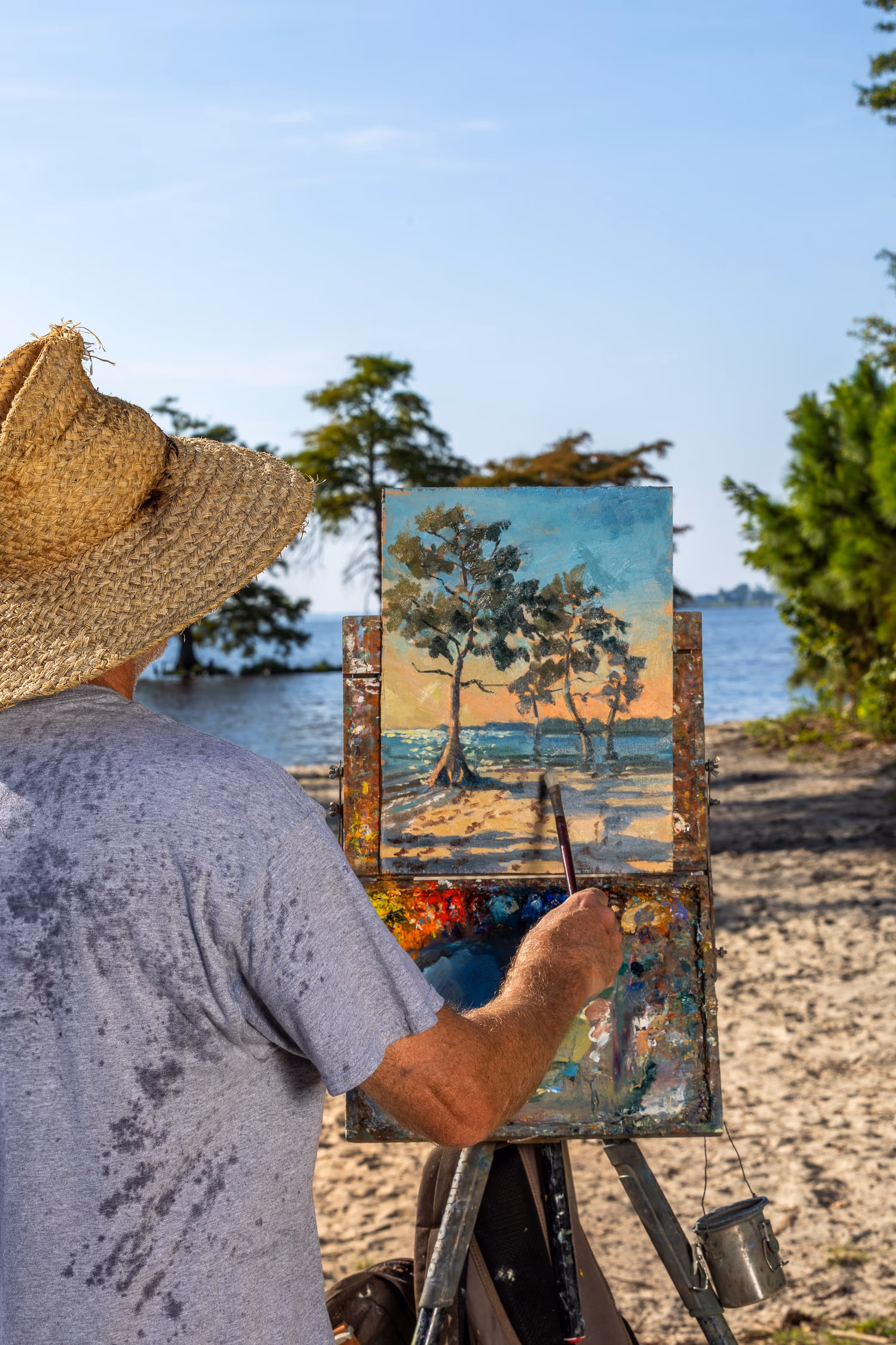 Rascoe paints Eastern North Carolina landscapes and the images they offer of a lifestyle closely tied to the land. He paints tobacco barns and sailboats, cypress trees and farm fields. He works in the plein air technique; French for “open air,” the approach roots the artist outside and in the moment. And he paints with an Italian style known as “alla prima,” which requires layering wet paint over wet paint, often quickly, always with great intent.